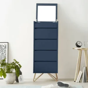 The Royal Blue Wooden 5 Drawer Tallboy with Copper Legs Furniture in UK is a stunning addition to any bedroom. The sleek and modern design is crafted from high-quality wood and boasts a beautiful royal blue finish that will brighten up any space. The copper legs add a touch of luxury and sophistication to the piece.