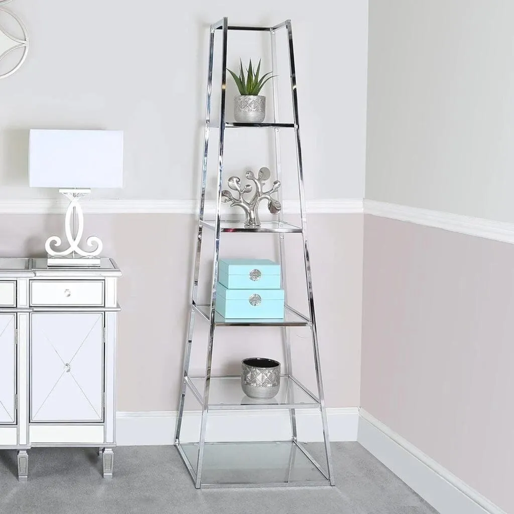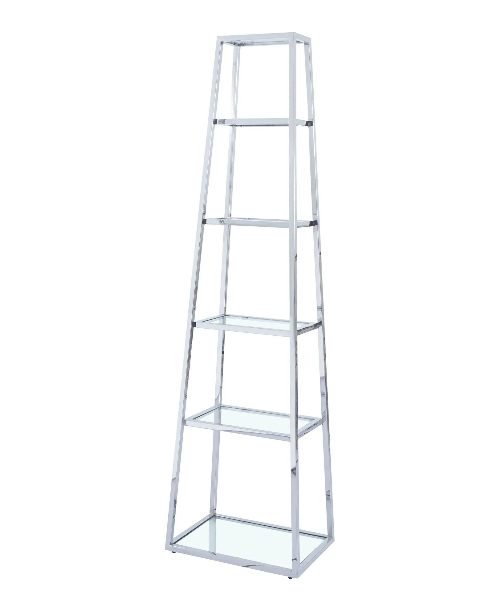 The Aire Glass Bookcase is a staple of modern furniture, with its sleek stainless steel contrasting with solid glass shelves. This item will reflect the light in any room creating the illusion of a bigger space. A multi-functional piece that can be used as a bookcase or simply just an ornament stand. The pyramid design gives a feel of space saving whilst boasting 5 levels of space.