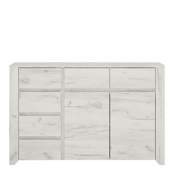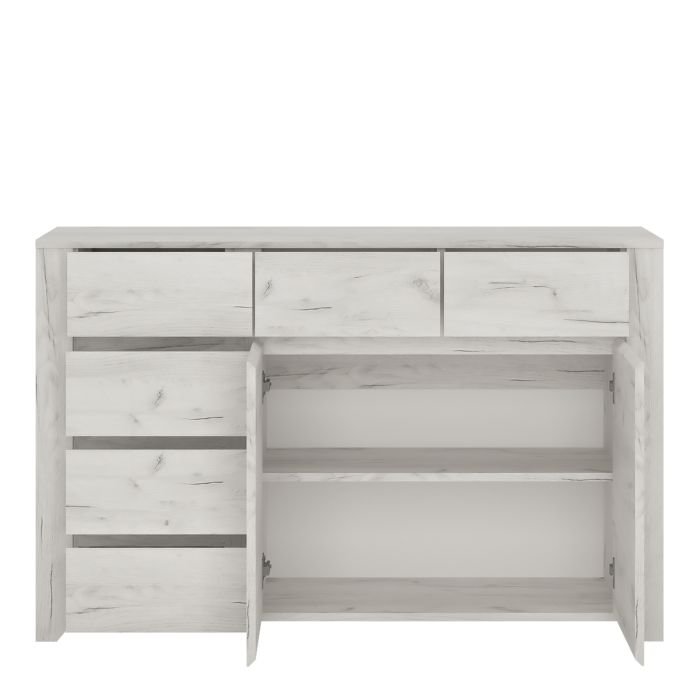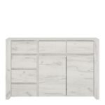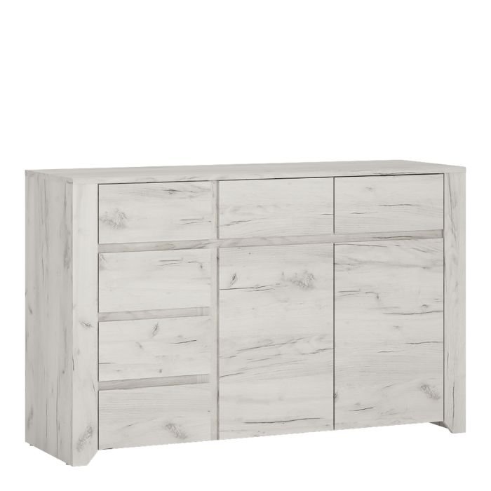 This beautifull bedroom collection is contemporay and stylish and suitable for all age groups, finished in a modern hard wearing white crafted Oak melamine. This extra wide chest has lots of storage with 6 handy size drawers and 1 cupboards with interior shelving. cupboard with interior shelf.