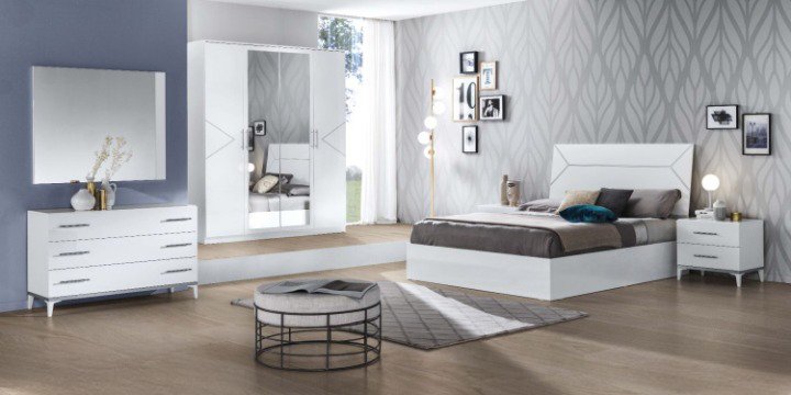 Italian furniture designers have long been known to combine elegant design with excellent construction quality to provide furniture which both looks good and lasts. Elegance Bed Group Set included 4 door wardrobe, bed frame, night tables, mirror and dresser all crafted using the finest quality material in a lovely White and Silver finish with antique metal handle.
