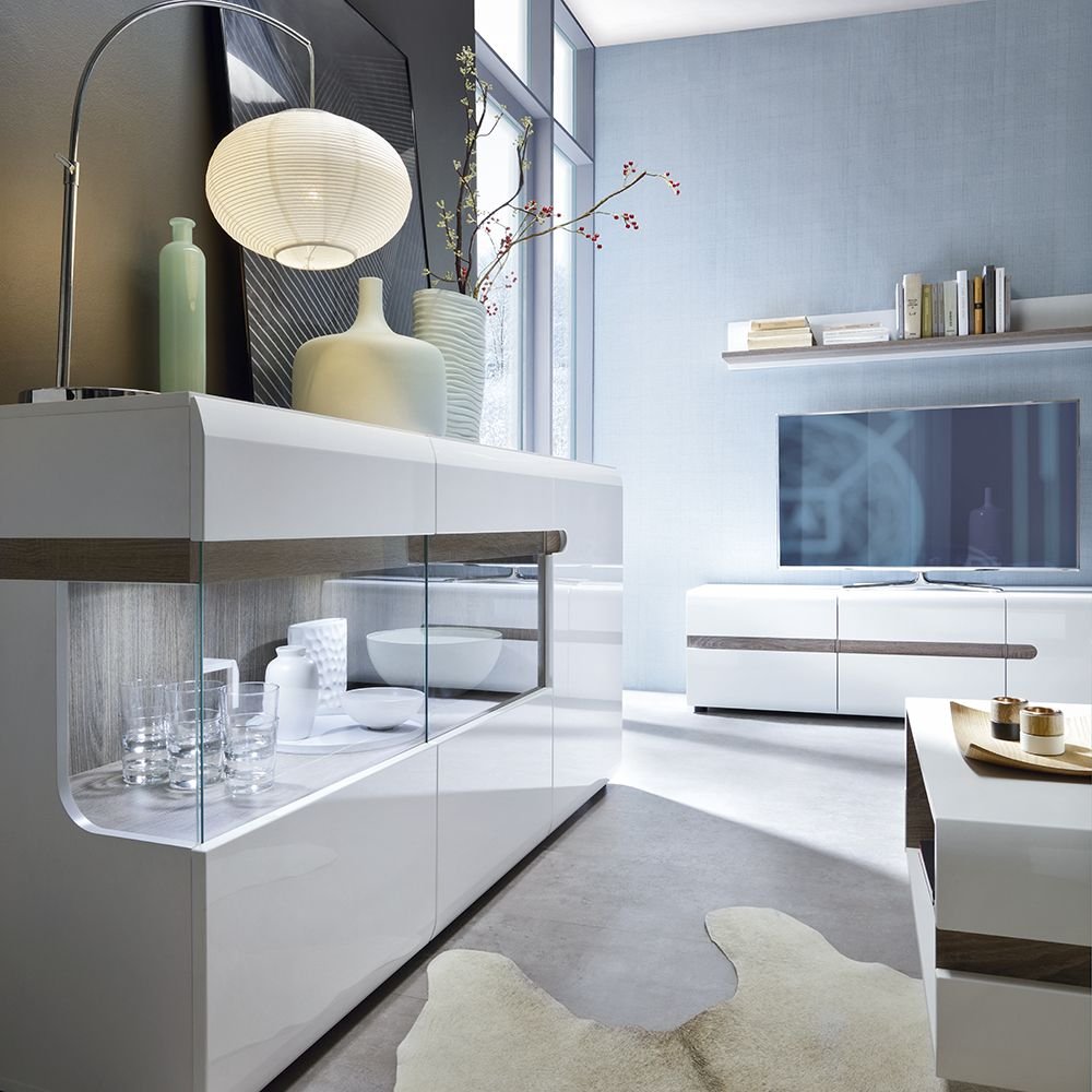 Unconventional design – a proposal for the followers of the latest trends. The clever mix of scratch resistant white melamine with beautiful high gloss fronts and oak melamine trim makes this top quality collection of furniture the ideal destination for the most modern of homes, the massive range that includes many cabinets and wall units fulfils every storage and display option. Optional lighting available: Quadro 2 Point light fitting inc GB plug
