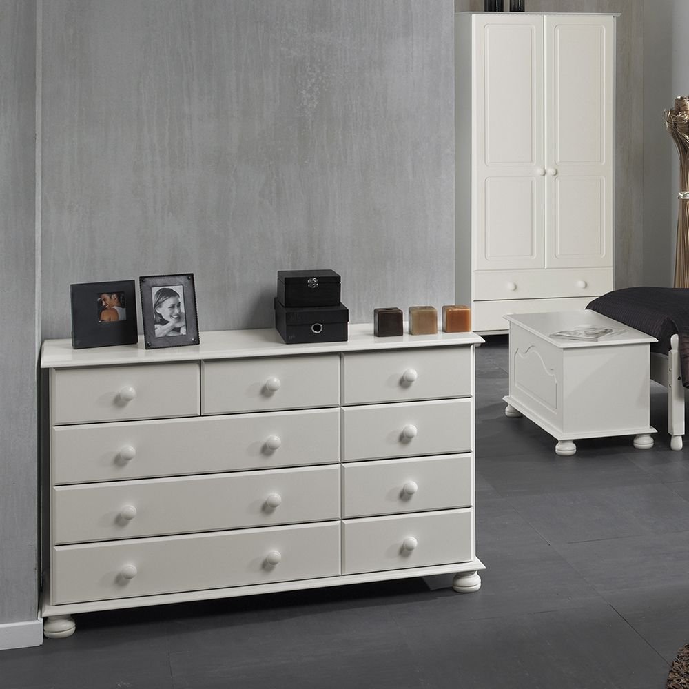 Bramwell 2 + 3 + 4 Drawer Extra wide chestĀ in attractive off white MDF is a large, stylish solid chest of drawers with lots of storage space. The top makes a nice area for a mirrorĀ or photos and the total of 9 easy gliding drawers with cam lok drawer fronts gives lots of storage space. Crafted from white MDF and finished with a smooth lacquer makes this a durable and attractive choice for any bedroom.