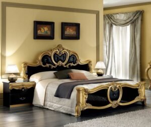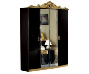 Barocco Bedroom Set is a valuable addition to your bedroom. This Bedroom set Including Bed +2 Nigh Tables + Mirror + Single Dresser + 4 Door Wardrobe. This Bedroom set constructed from strong, and quality Italian materials and finished in a delicate tones of black, stylish Gold handle and Gold decorative detail on frames and columns creating a romantic feel to your bedroom.