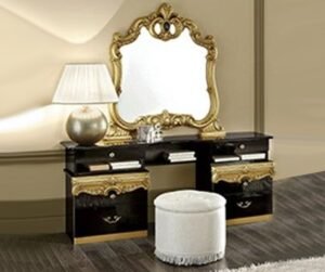 Barocco Bedroom Set is rich, classic looking unit that adds a modern feel to your homes surroundings. This Bedroom set Including Bed +2 Nigh Tables + Mirror + Vanity Dresser + 4 Door Wardrobe. This Bedroom set constructed from strong, and quality Italian materials and finished in a delicate tones of black, stylish Gold handle and Gold decorative detail on frames and columns would look great in any bedroom setting.