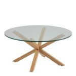 Bring a touch of modern elegance to your living space with this round coffee table, featuring a sleek tempered glass top. The oak foil cross base adds a contemporary flair, making it the perfect addition to any chic and stylish interior.