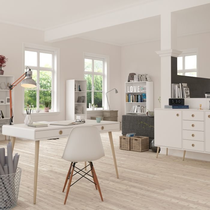 Finished in white with pine stained handles and tapered legs, the Softline desk brings mid-century style to any home. The clean, streamlined appeal of this unit suits almost any decor, and will look great whether you opt for it as a standalone piece, or choose other items from the range to complete the look.