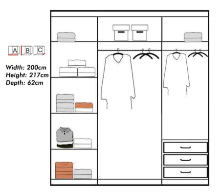 Specifications:- Wardrobe 90cm includes: 2 sliding mirror doors 4 shelves 1 hanging rail. Dimensions: Width: 90cm Height: 200cm Depth: 62cm