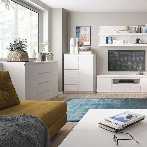 Another offer of a chest of drawers from the Fribo collection, inside you can find four drawers equipped with a full extension system and shelves in a closed space. The white chest of drawers with a geometric shape will work well in interiors decorated in a minimalist or modern style, thanks to its simple form it can be combined with other elements of the Fribo collection. The chest of drawers is equipped with an ergonomic handle-free system. The furniture is made of laminated chipboard, resistant to moisture, scratches, damage and high temperature. The program is available in two Colour versions: Alpine White and Golden Ribbeck Oak.