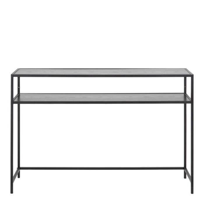 Introducing a versatile console table from Home Store UK, perfect for enhancing any modern space. With its sleek matte black steel base and two ash black shelves, it seamlessly combines style and practicality, offering ample storage while complementing your décor.
