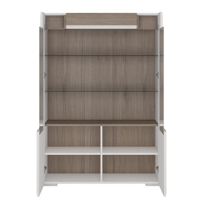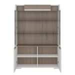 Low Glazed 2 Door Display cabinet with internal shelves, High Gloss with San Remo Oak inset (inc. Plexi Lighting). A delightful low glazed display cabinet that has many features including soft close doors, internal LED lighting and adjustable shelves. Warm and yet cool living and dining collection in white High Gloss with San Remo Oak inset.
