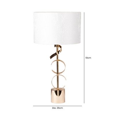 This 51cm gold metal swirl table lamp with solid cylindrical base and with white cotton shade lined in gold adds a contemporary touch to any lounge, hallway or bedroom. Its stylish, modern swirl design and on-trend colour palette will light your interior to perfection.