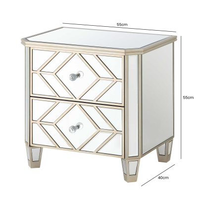Bring sumptuous sophistication to your decor with our deco-inspired HUSK- 2 Drawer Mirror Cabinet in the mirror with champagne geometric design and trim and crystal knob handles. Luxurious and elegant, either on its own or with another item from the range, its ample storage will add a decadent appeal to your bedroom.