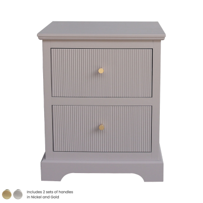The 2-drawer bedside in the summer grey wood finish is an elegant addition to any bedroom area. The ample drawer fronts? grooved design is further enhanced by a choice of either nickel or gold effect knob handles.