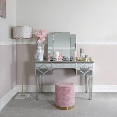 A perfect addition to your bedroom, the stunningly elegant design is inspired by the ornate glitz of Morocco. This Marrakech dressing table brings a chic charm into your interior featuring mirrored paneling throughout, 5 storage compartments with drawer runners, and the quatrefoil detailing on the side drawers along with silver framed edges. This would also make a console, writing desk, or workstation.