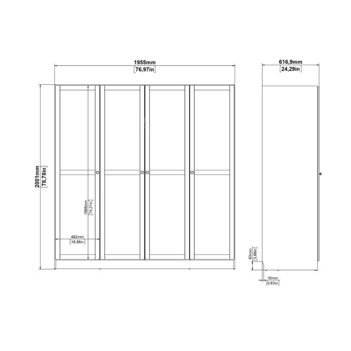 Introducing the Home Store UK Wardrobe: a perfect combination of modern design and practical functionality. Featuring four framed doors and nine shelves—six of which are adjustable—it seamlessly adapts to your storage needs. Whether you like to hang your clothes or prefer to fold them neatly, the Home Store UK Wardrobe provides versatile organization options for all your belongings.