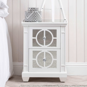 Our HUSK- White Wood 2-Drawer Bedside Cabinet is a beautiful blend of modern and traditional that will enhance the overall aesthetic of your living space. The mirrored doors are overlaid with white gloss wood effect geometric circular panels and have exquisite crystal handles. This elegant piece would work equally well as an end table, occasional, or display table.