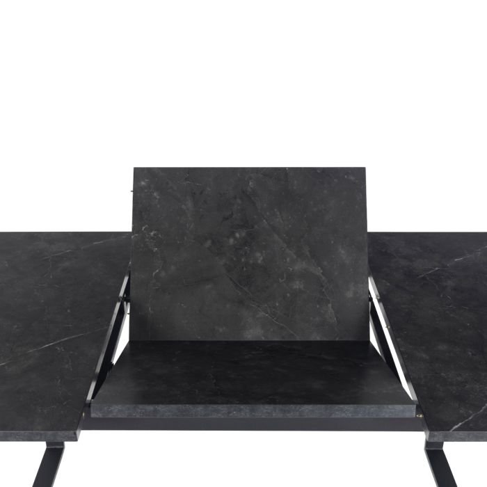 At Home Store UK, this dining table strikes the perfect balance between aesthetics and practicality, destined to be a favorite in your home. With its rectangular tabletop showcasing a sleek black marble effect, it adds both warmth and a modern touch to your dining area. The convenient butterfly extension makes it easy to expand with a matching leaf, while the black metal sledge legs enhance the table’s contemporary appeal.