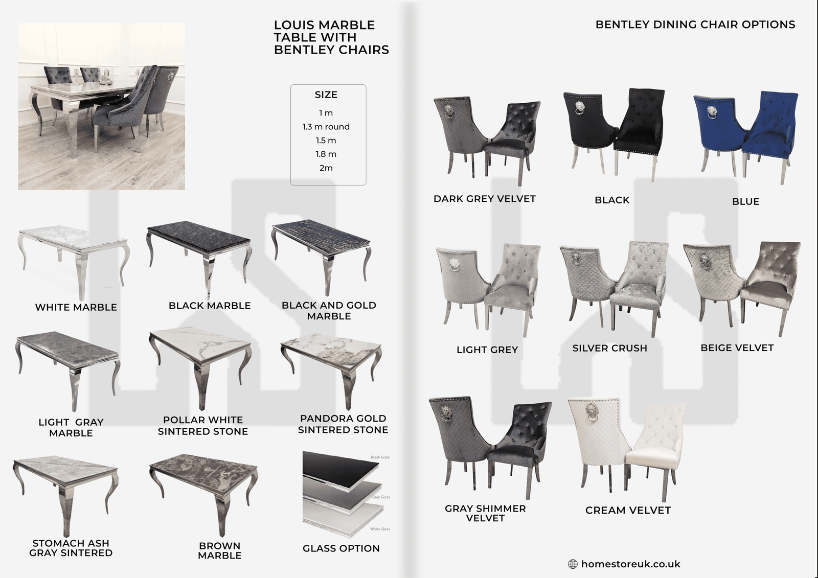 The ultra chic and glamorous Louis Marble Dining Table With bentley Chairs will redefine high end living. This contemporary dining table comes with a beautiful marble or glass top, polished stainless steel swooping base, and is incredibly hard-wearing and scratch resistant.