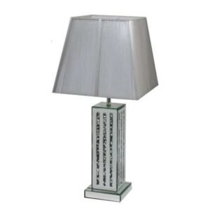 A striking balance between a simple piece of furniture and understated glamour, the Gatsby range features borders filled with shining diamond-like crystals. This beautiful item is made of Mirrored Glass and MDF, and is part of the Gatsby range.side table with lamp