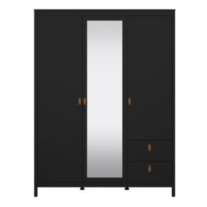 A modern glass display cabinet with two doors and three drawers in a striking design complete with brown leather tab handles, also available in white and matt black
