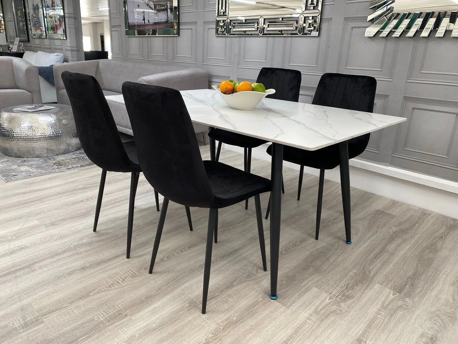 The “Raven White Marble Effect Dining Table” embodies timeless elegance and modern design. Meticulously curated, this table seamlessly combines the luxurious look of white marble with contemporary appeal, making it a striking focal point for any dining space. The table features intricate detailing and a sleek silhouette that enhances your dining area’s ambiance. With its unique marble effect, the “Raven White Marble Effect Dining Table” effortlessly harmonizes style and practicality. Beyond ordinary furniture, it becomes a statement of refined taste and upscale living. Elevate your dining experience with this table, where design and sophistication unite harmoniously for memorable meals.