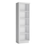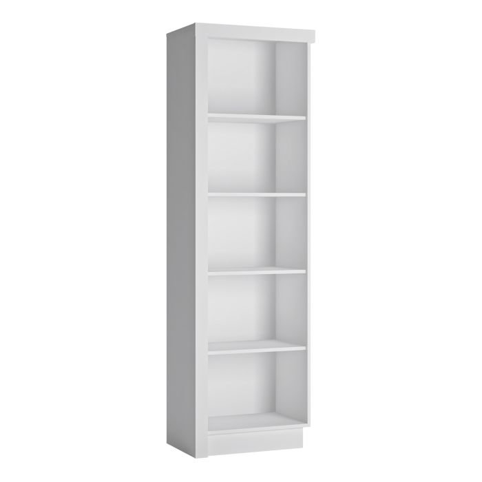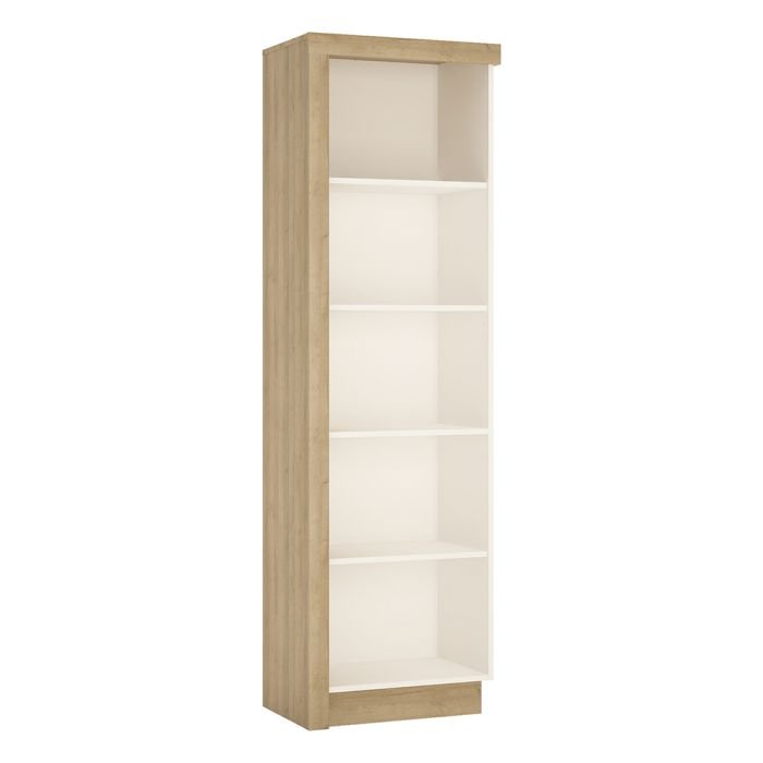 This bookcase has plenty of space to display family treasures or your favourite book collection. Right hand orientation. The designers of this range have combined several rectangular shapes and produced a modern collection in 3 different colourways, Riviera light oak and white high gloss fronts, contrasting greys and white and gloss white.