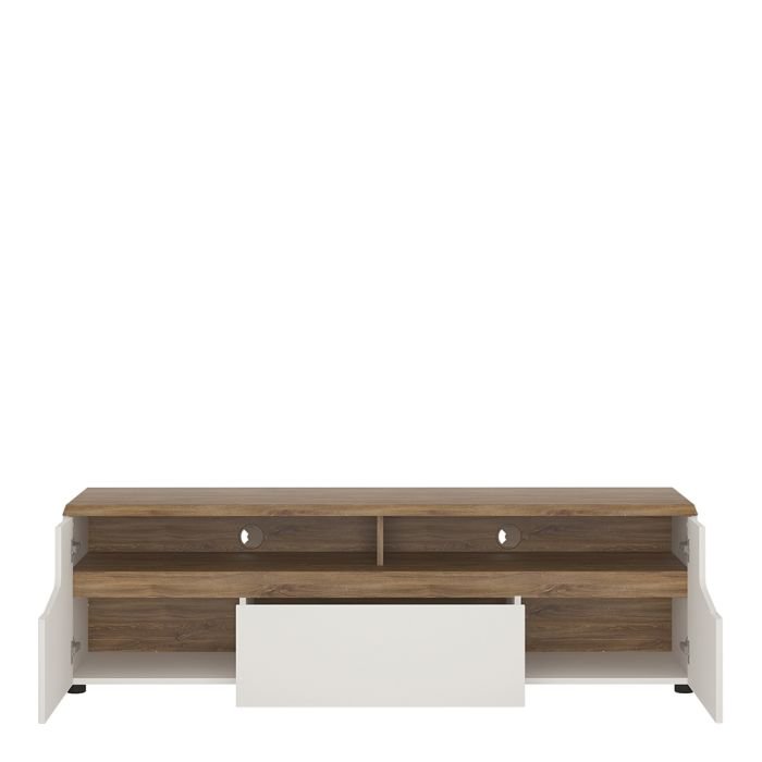 Wide TV unit with openings for satellite accessories, and plenty of storage. This great collection is perfect for lovers of bright and moderne interiors, striking and sophisticated.
