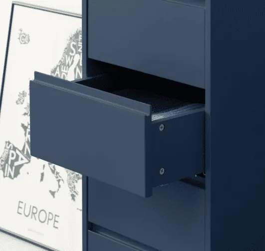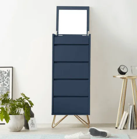 The Royal Blue Wooden 5 Drawer Tallboy with Copper Legs Furniture in UK is a stunning addition to any bedroom. The sleek and modern design is crafted from high-quality wood and boasts a beautiful royal blue finish that will brighten up any space. The copper legs add a touch of luxury and sophistication to the piece.