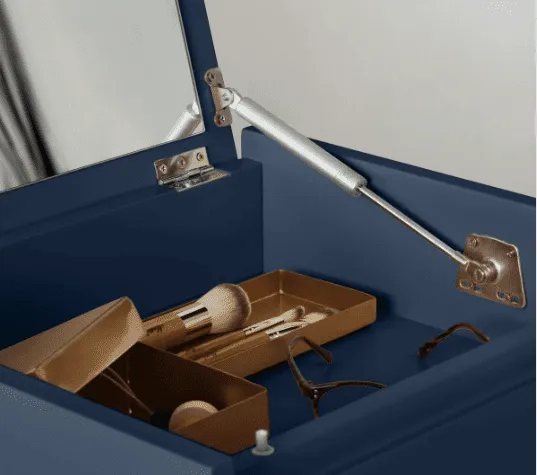 - 4 drawers pull out on runners but the 5th compartment opens up from the top to reveal the storage section with a mirror attached to the lid, perfect for makeup/jewellery.