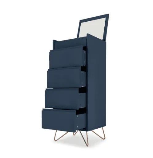 Royal Blue Wooden 5 Drawer Tallboy with Copper Legs: