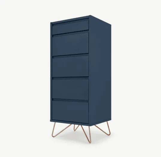 - A 5 drawer tallboy with a royal blue coloured finish with copper legs.