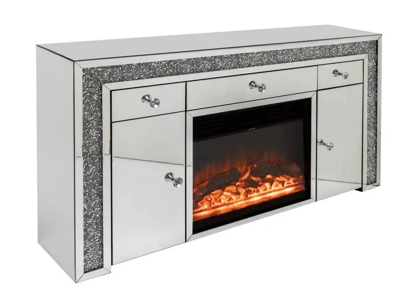 An elegant twist on a contemporary fireplace, encased in a mirror glass sideboard with accents of diamond crush.