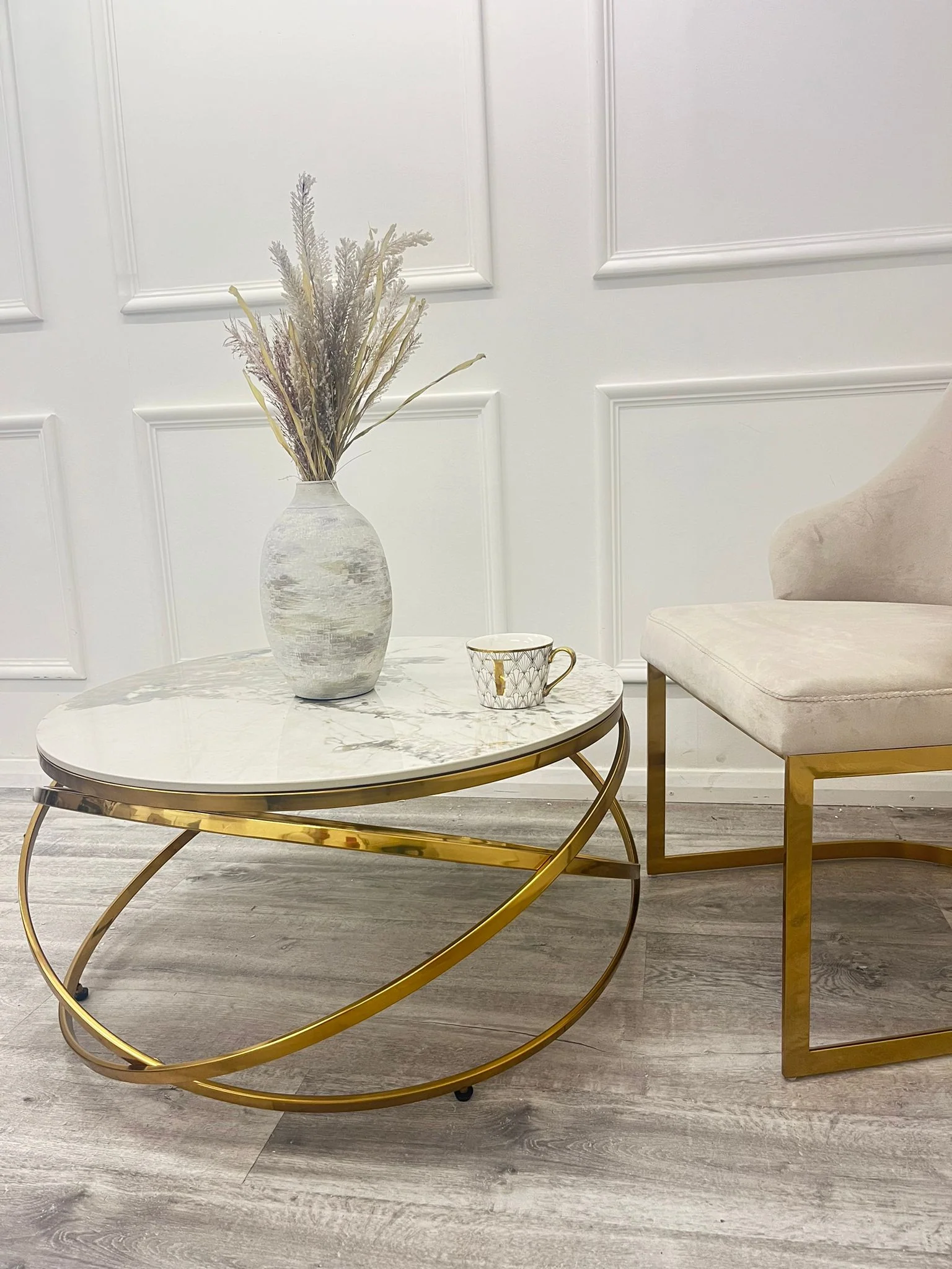 Check out our collection of coffee tables made from various materials, each with its look and purpose. Choose a marble coffee table like the Marble Coffee Table with Gold Legs for a touch of class and beauty that will never go out of style.