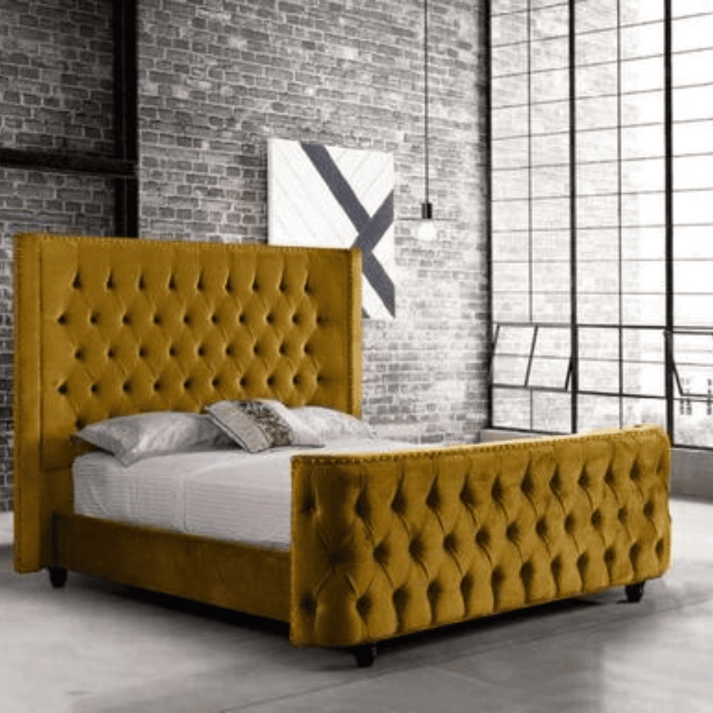This is an attractive bed that has an exclusive style, handmade plication complemented with parts and edging across the headboard, this excellent bed frame is sure to leave a long-lasting impression in any room decor, available in many magnificent plush velvet colors proficiently handcrafted in the UK, along with strong wooden slats