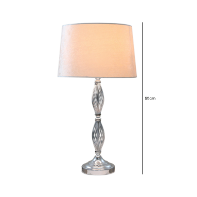 53cm Chrome Metal table lamp including an ivory velvet cylinder lamp shade. This product comes with a UK EU Dual Plug. You can now sell this product to customers from all over Europe and the UK.