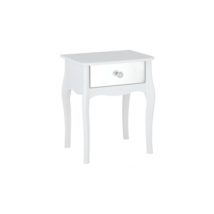 This Provence-inspired Victoria Bedside Table with a mirrored drawer front and crystal handle brings a touch of elegance to any bedroom. With delicate detailing, a crisp white finish, and stainless steel handles, this piece works well with any style of room. The mirrored drawer front adds a touch of glamour, while the crystal handle enhances its luxurious appeal. This classic bedside cabinet offers a drawer and open cabinet for ample storage, ideal for keeping your sleeping space uncluttered.